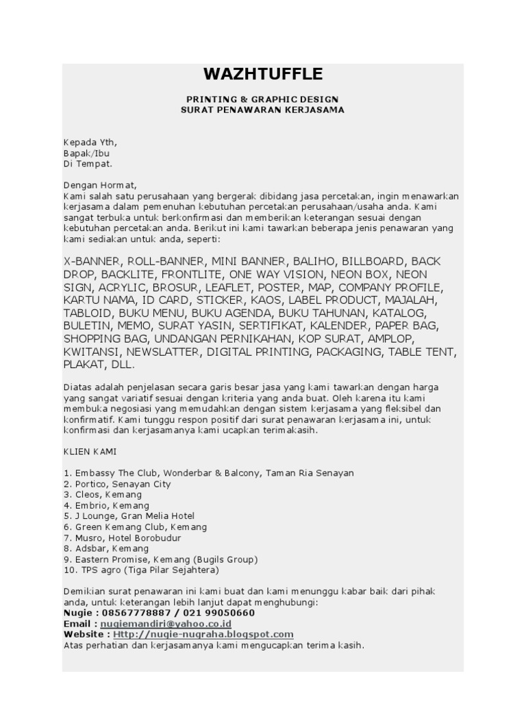 Contoh Surat Penawaran Kerjasama Jasa Percetakan : Proposal Penawaran Produck - Contoh surat penawaran untuk berbagai keperluan.. Biasanya surat penawaran ini dibuat oleh para pengusaha atau pebisnis dalam segi ekonomi berupa negosiasi. Contoh surat penawaran jasa konsultan. Dalam dunia bisnis, penawaran akan selalu ada antara pihak satu dengan pihak lainnya. Tujuan dibuat surat penawaran ini. Contoh surat penawaran harga jasa.